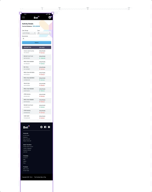 One notable challenge arose during this phase: scaling the activity history table for smaller screen sizes. To address this, I condensed the five columns of data into two categories for the mobile breakpoint. This entailed merging date and description into one column and incorporating running balance and withdrawal/deposit details into the second.