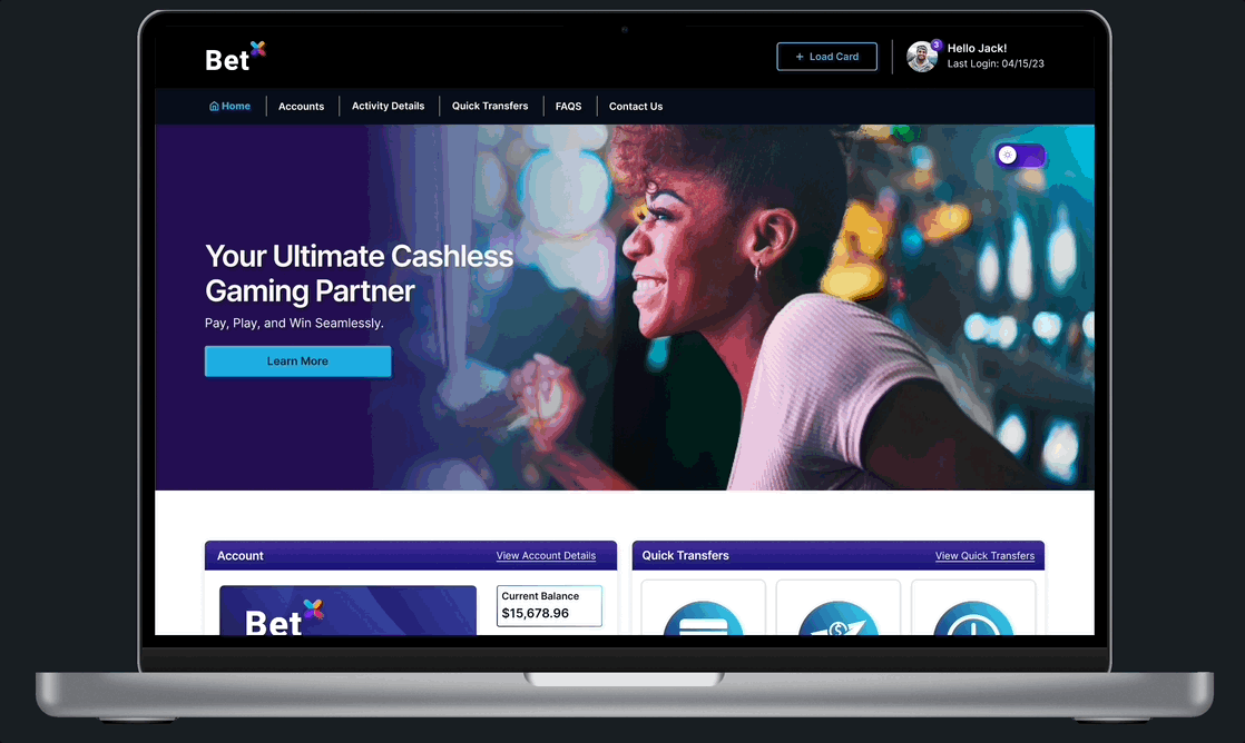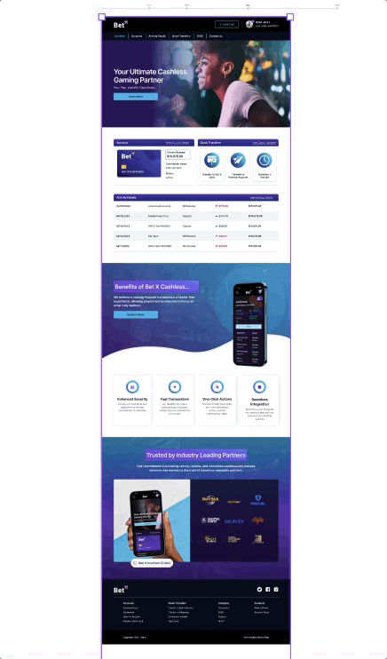 The landing page features essential components, including Account Information, Quick Transfer Options, Activity History, Benefits of Bet X's cashless service, and prominent Industry-leading partners. Elements were strategically organized for effortless user navigation and engagement.